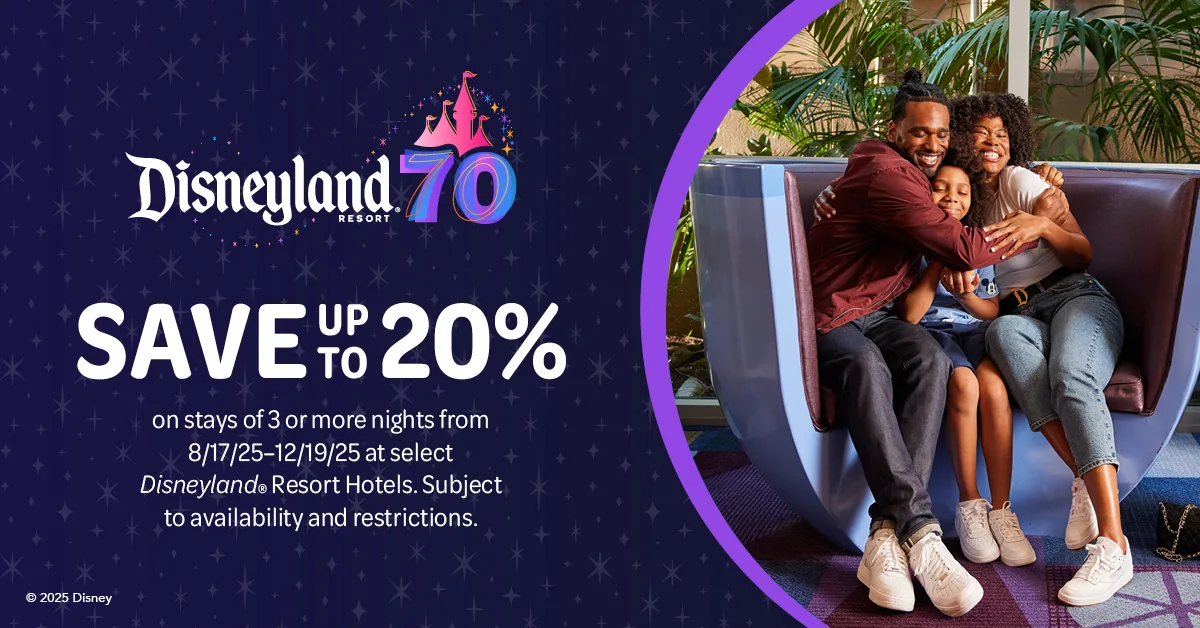 on select stays of 3 or more nights at a Disneyland Resort hotel from Aug. 17 through Dec. 19, 2025. Book by Dec. 16, 2025. Travel must be completed by Dec. 20, 2025.